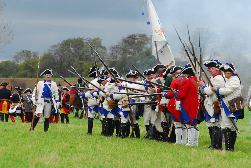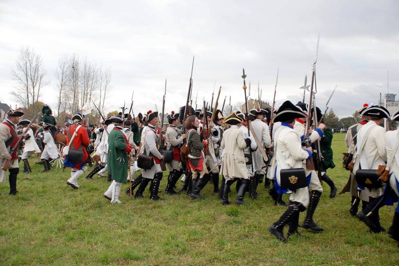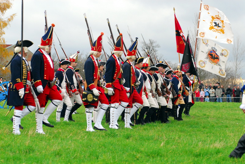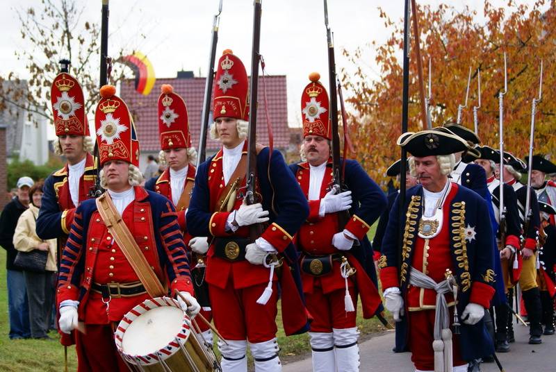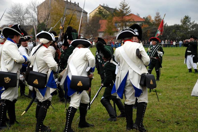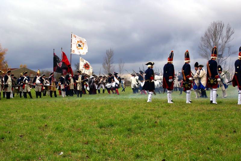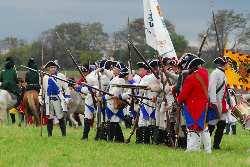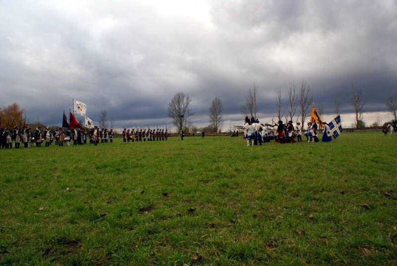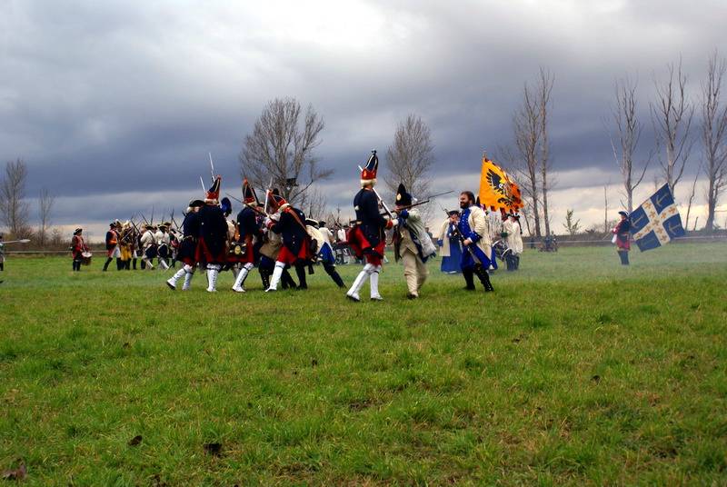 Wir (diesmal die Reichsarmee darstellend) hatten uns schon frühzeitig für einen Marsch auf historischen Pfaden entschlossen. Dank fleißiger Helfer wurde unser Compagniewagen rechtzeitig fertig und ein Kutscher mit zwei Pferden für unser Vorhaben gefunden. Nach Recherchen über den alten Anmarschweg der Alliierten Reichsarmee und Ausnutzung jetzt vorhandener Feldwege, erarbeiteten wir uns eine Marschroute. So machten wir uns auf den 15km langen Marsch. Etwas abweichend von der Historie besuchten wir das alte Rittergut in Roßbach, von dessen Dachboden Friedrich die Reichsarmee beobachtete, und wurden dort mit Speis und Trank aufs freundlichste begrüßt. Nach der Ankunft in Reichardtswerben nahmen wir an dem Umzug und der Gefechtsdarstellung in Reichardtswerben teil.