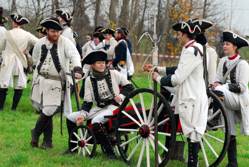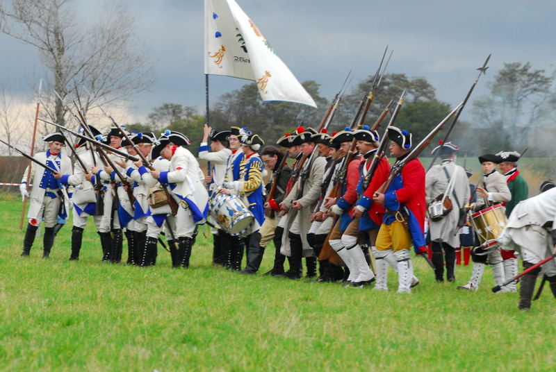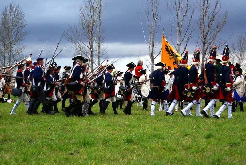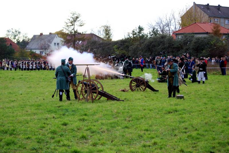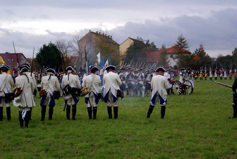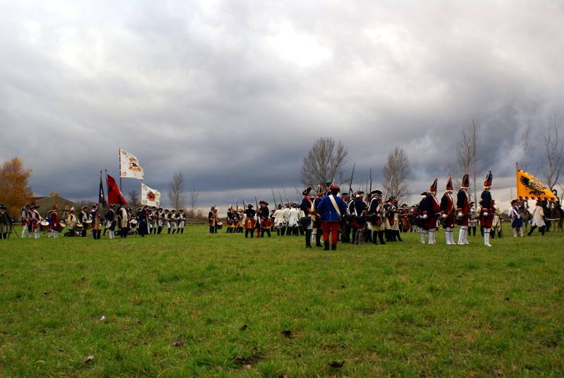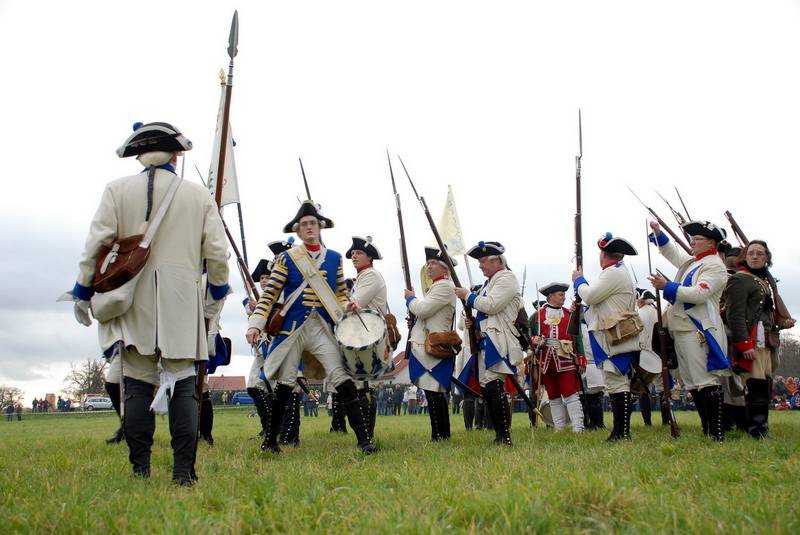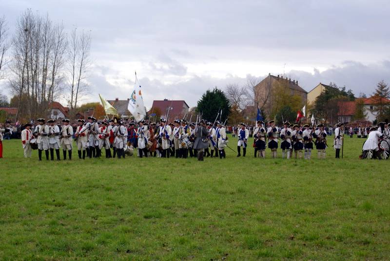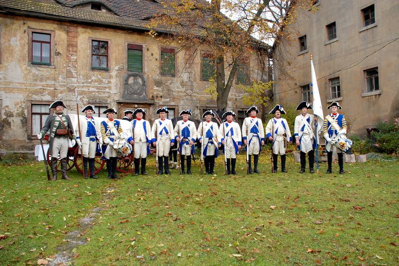 Wir (diesmal die Reichsarmee darstellend) hatten uns schon frühzeitig für einen Marsch auf historischen Pfaden entschlossen. Dank fleißiger Helfer wurde unser Compagniewagen rechtzeitig fertig und ein Kutscher mit zwei Pferden für unser Vorhaben gefunden. Nach Recherchen über den alten Anmarschweg der Alliierten Reichsarmee und Ausnutzung jetzt vorhandener Feldwege, erarbeiteten wir uns eine Marschroute. So machten wir uns auf den 15km langen Marsch. Etwas abweichend von der Historie besuchten wir das alte Rittergut in Roßbach, von dessen Dachboden Friedrich die Reichsarmee beobachtete, und wurden dort mit Speis und Trank aufs freundlichste begrüßt. Nach der Ankunft in Reichardtswerben nahmen wir an dem Umzug und der Gefechtsdarstellung in Reichardtswerben teil.